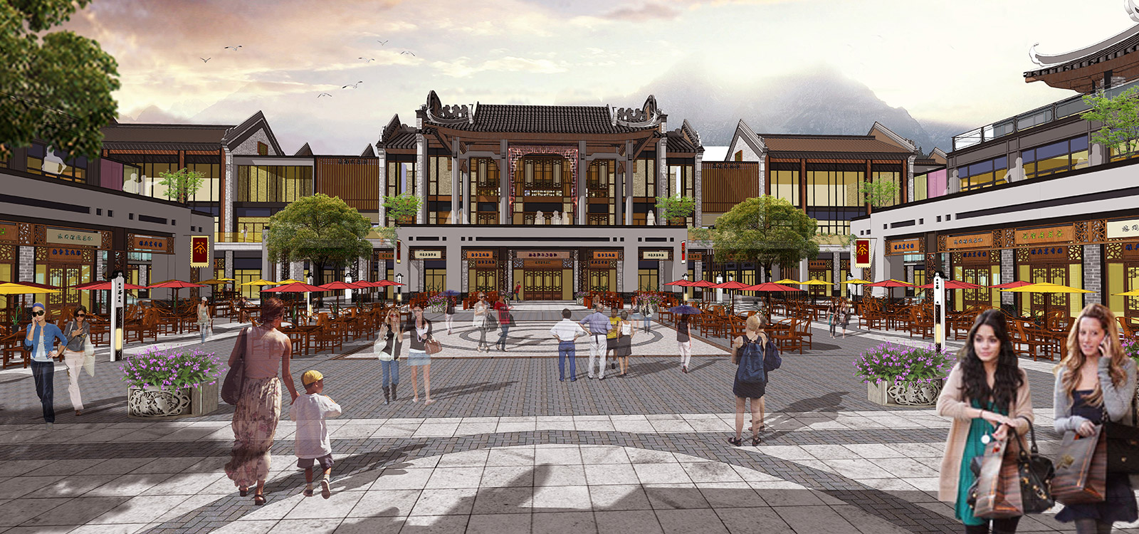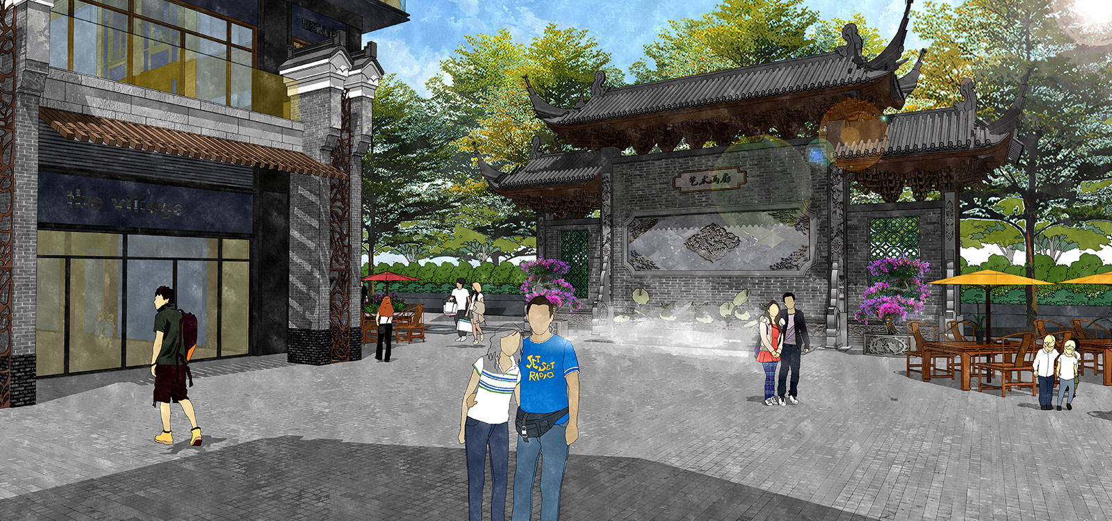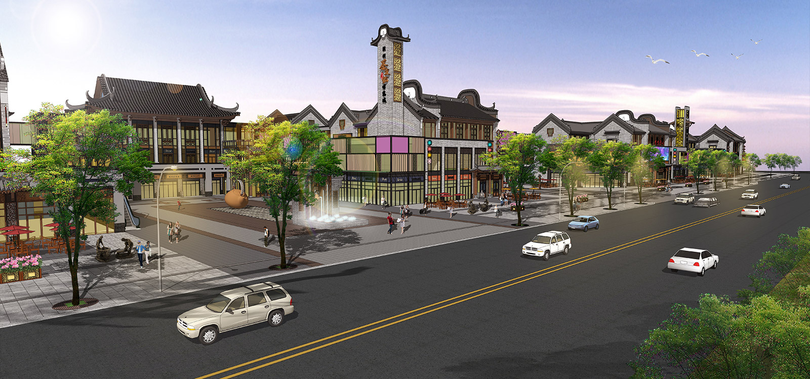 本项目分商业街及住宅区两部分,商业街采用广府文化的照壁元素与岭南园林假山文化相映衬,营造街头独特景观;住宅区采用简介干净的景观墙与建筑元素相呼应,与简洁大气草坪相映衬。
