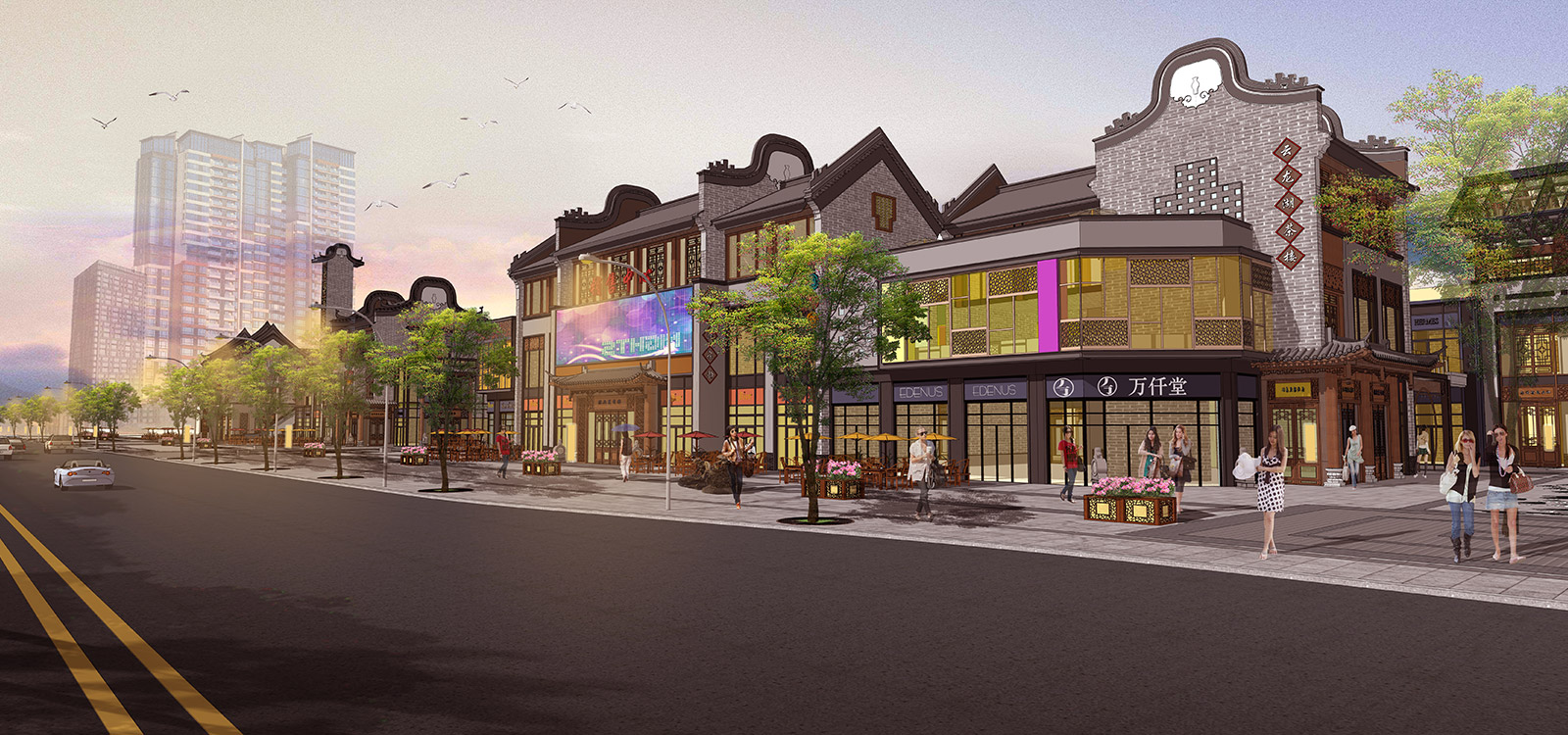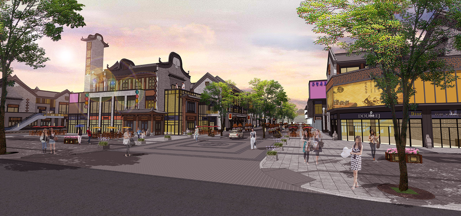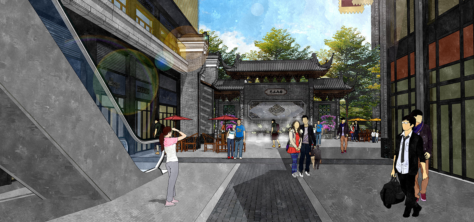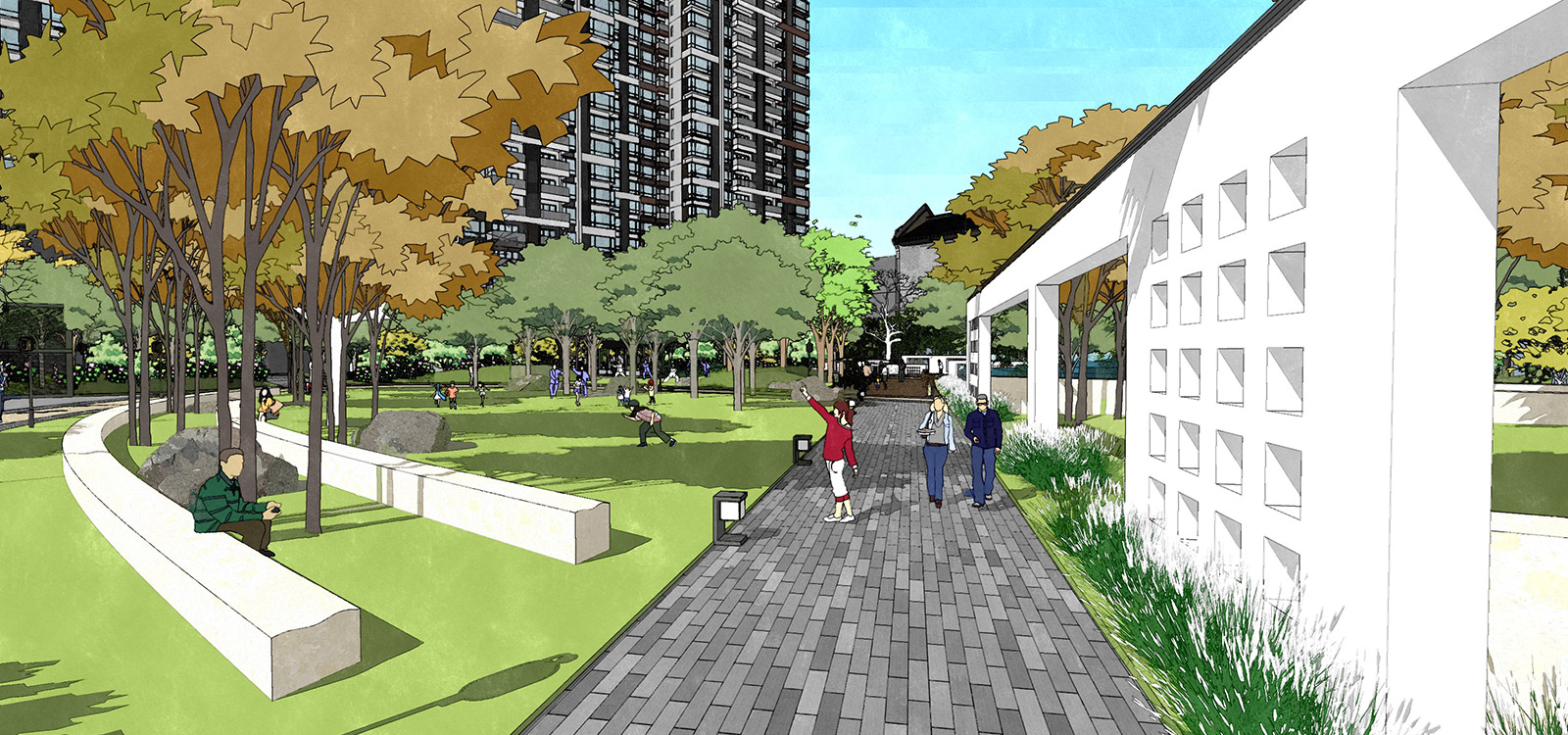 本项目分商业街及住宅区两部分,商业街采用广府文化的照壁元素与岭南园林假山文化相映衬,营造街头独特景观;住宅区采用简介干净的景观墙与建筑元素相呼应,与简洁大气草坪相映衬。